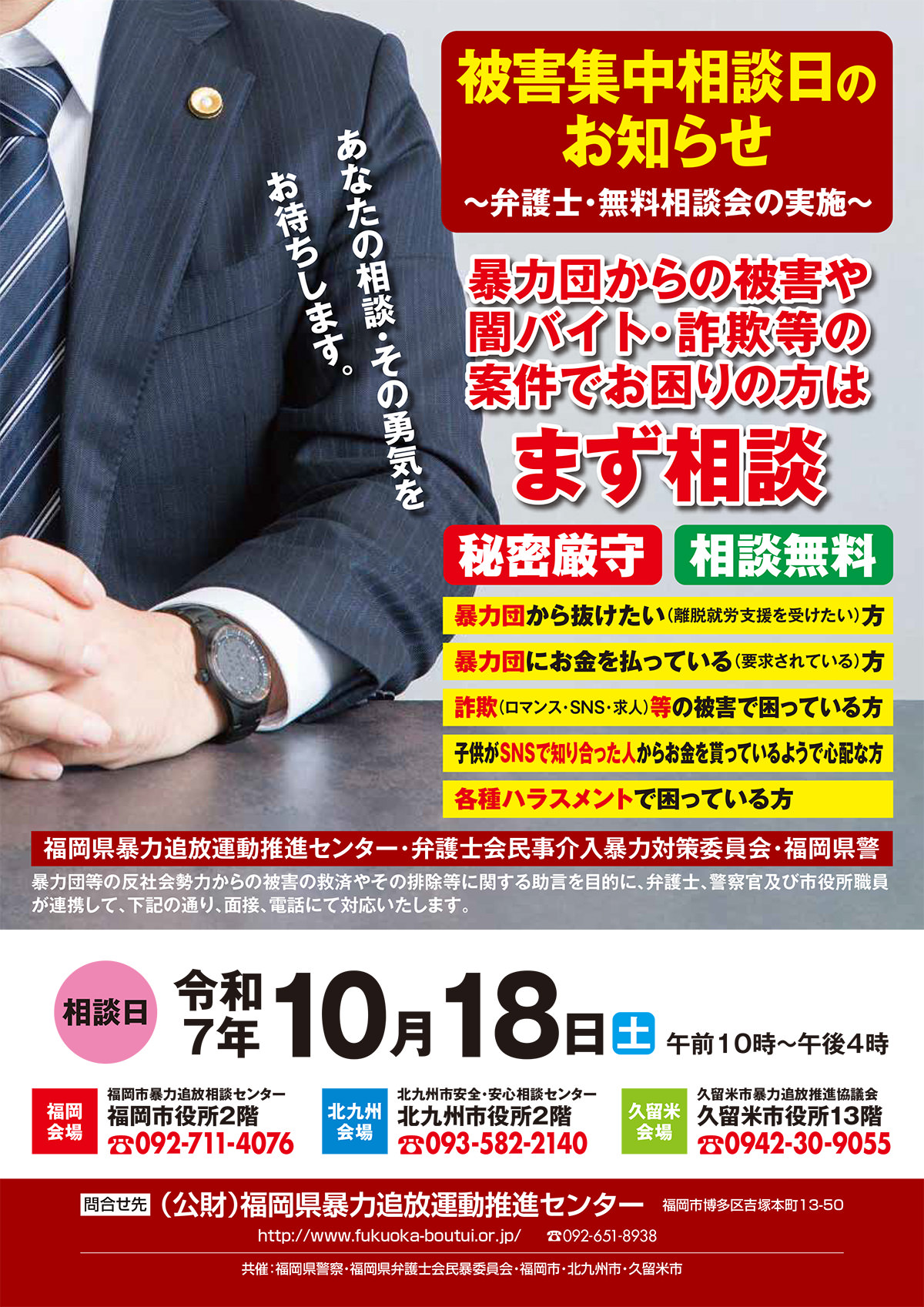 ○福岡会場(福岡市役所2階/福岡市暴力追放相談センター) ○北九州会場(北九州市役所2階/北九州市安全・安心相談センター) ○久留米会場(久留米市役所6階/久留米市暴力追放推進協議会) ※県内3つの会場で同時に開催いたします。 |